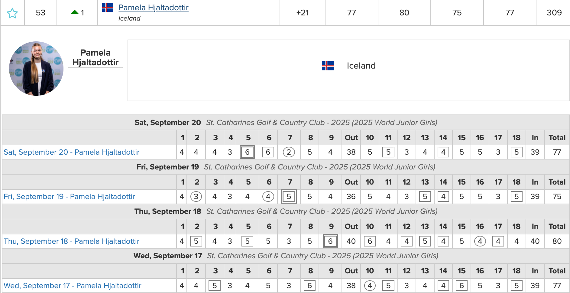 Pamela Ósk Hjaltadóttir var næst best á +21 í 53. sæti en hún var á 77-80-75-77.
