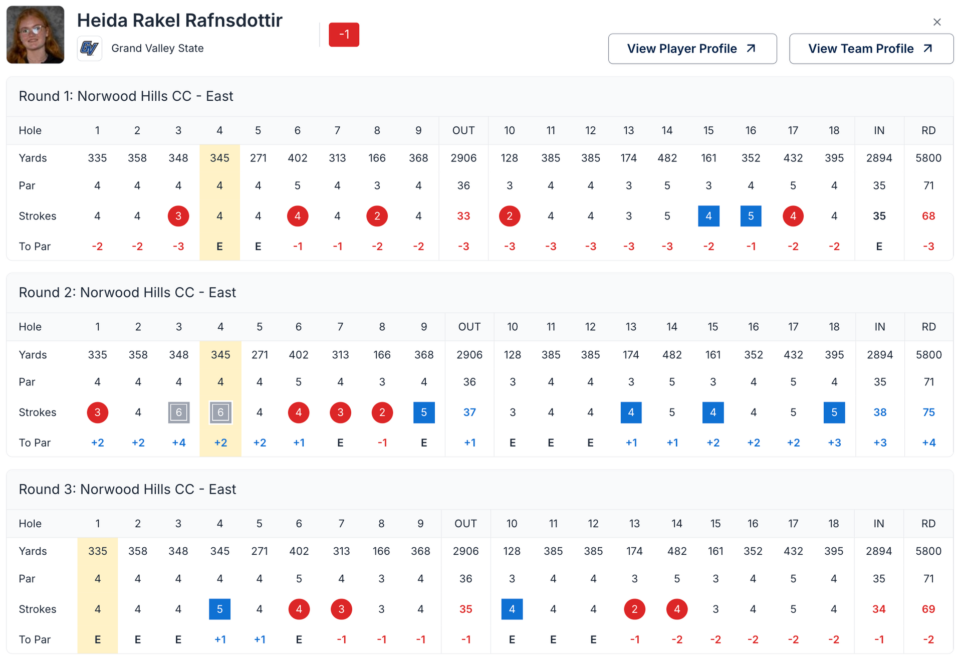 Heiða lék hringina á 68-75-69 eða einu höggi undir pari samtals og sigraði með 1 höggi. Einnig vann lið hennar Grand Valley State University með 7 högga mun eða á 23 höggum yfir pari samtals.